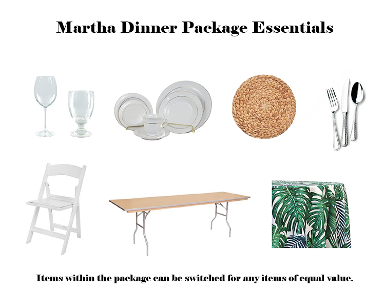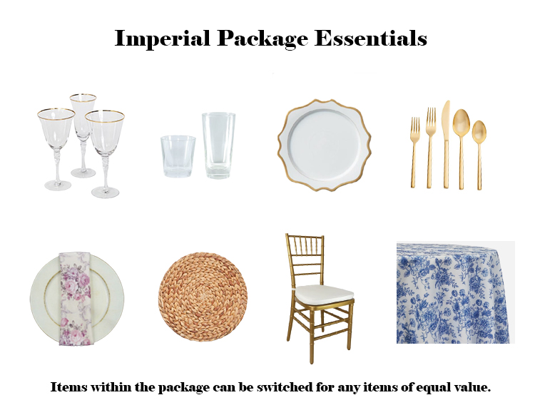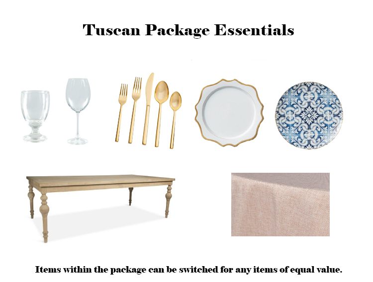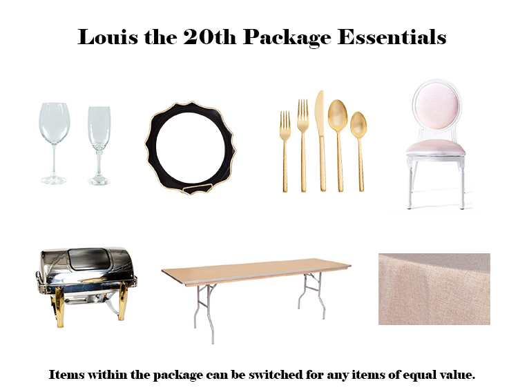 (6 Ft. Table, 2 Chaffers, Table Linen) 8 Ft. Rectangular Tables Louis Chairs Charger Plates Rectangular Dublin Tablecloths Dublin Napkin Luna Cutlery (5 piece set) Champagne Flutes Wine Glasses EXTRA OPTIONS:
