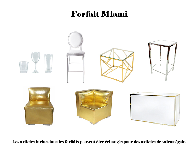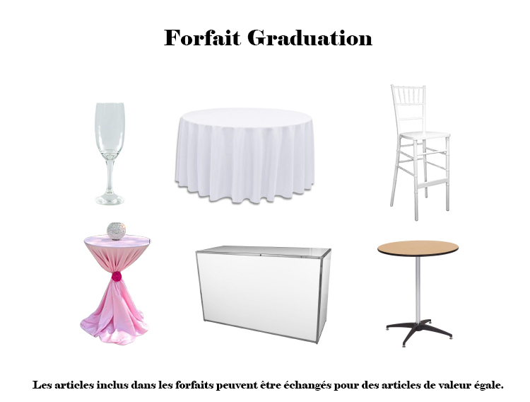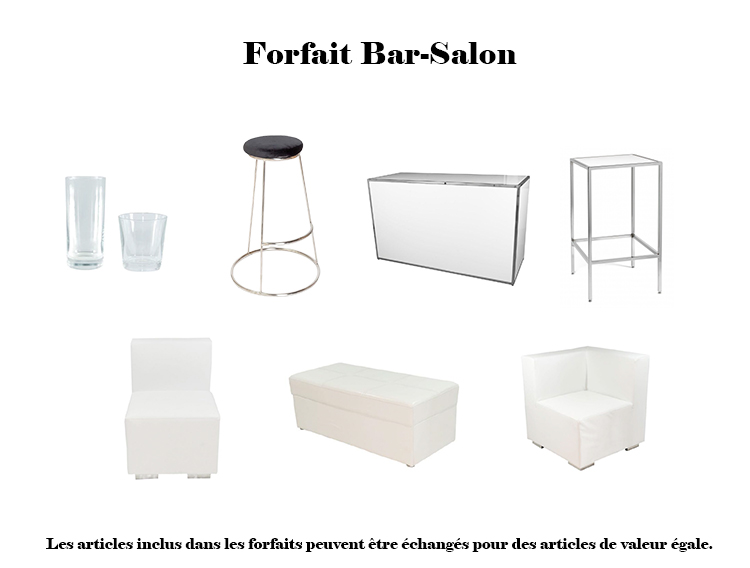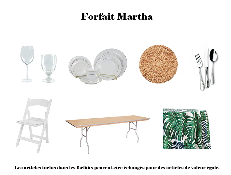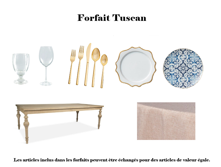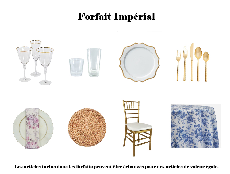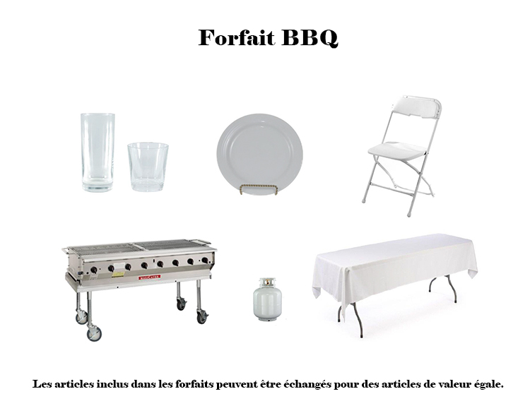 Tous les forfaits incluent l’installation de la tente. Les articles inclus dans les forfaits peuvent être échangés pour des articles de valeur égale.